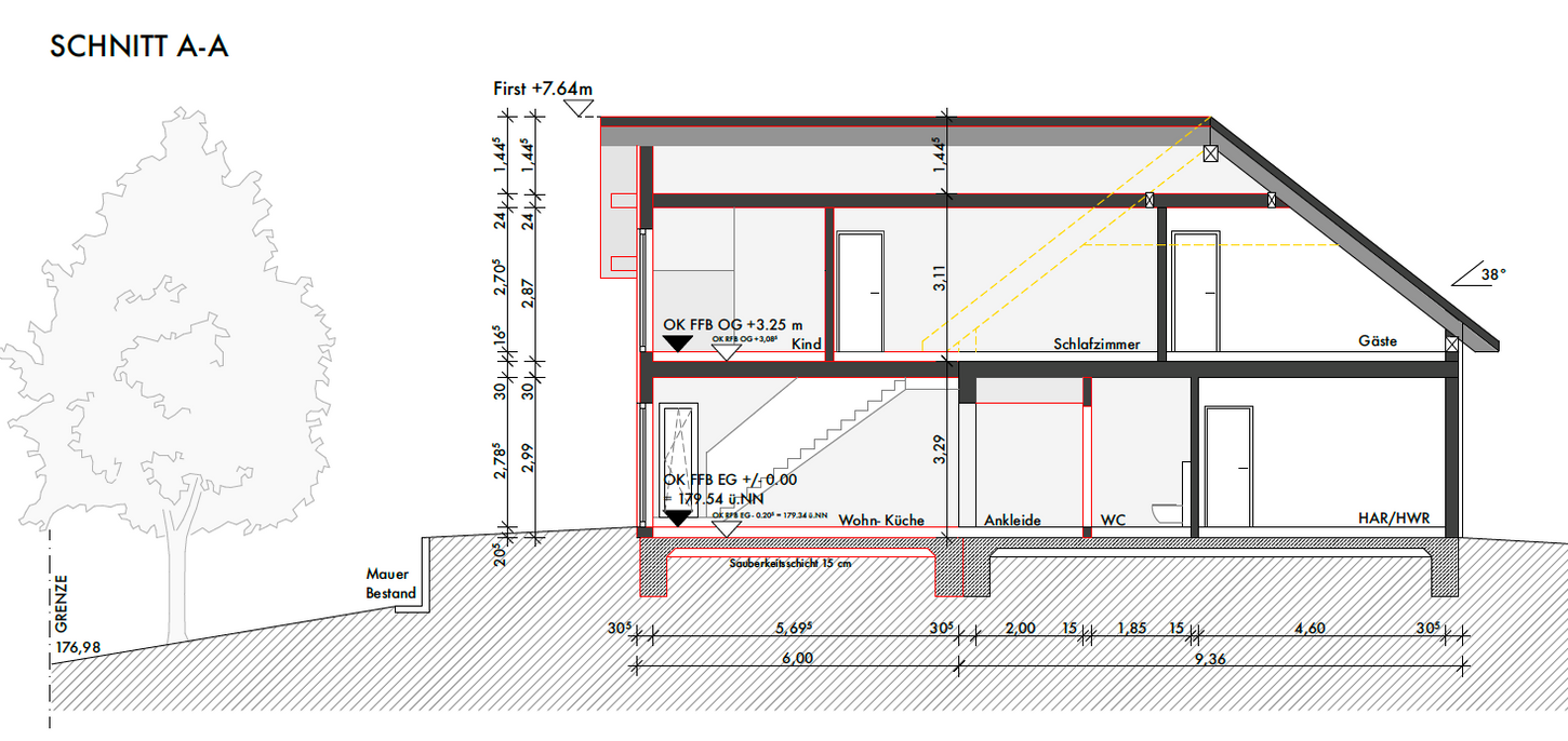 Das Gebäude wird als Holzrahmenbauweise mit Holzbalkendecke dem Bestand angepasst. Die bestehende Firsthöhe von 7.64 m, sowie die Dachform und Neigung werden für den Anbau übernommen. Somit ist ein Satteldach mit 38° Dachneigung vorgesehen. Die Dachfläche wird mit Mineralwolle gedämmt und mit Tonziegeln entsprechend dem Bestandsgebäude, gedeckt. Der Anbau wird ebenso auf eine Bodenplatte von ca. 0,20 m gestellt. Sämtliche vorhandenen Anschlüsse werden als Anschlußpunkte genutzt. Die Erschließung des Anbaus erfolgt durch eine Eingangstür im Bestandsgebäude (Carport), wo gleichzeitig ein WC, Heizung und Ankleide entstehen werden. Im anschließenden Anbau befindet sich der Wohn-Essbereich mit Treppenlauf in das Dachgeschoss. Hier wird ein Schlafzimmer mit Ankleide, sowie ein Kinderzimmer und ein Bad entstehen. Die Zugänge zum Bestand werden lediglich verschlossen und nicht zugebaut.
